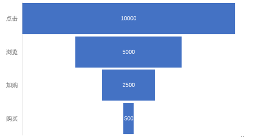 通过上表和图,我们可以清晰地看到用户在不同阶段的数量以及转化率。例如,虽然访问网站的用户数量很多,但是最终完成购买的用户却相对较少。这可能意味着我们的网站在吸引用户的同时,还需要改善购买流程或提升用户信任度。